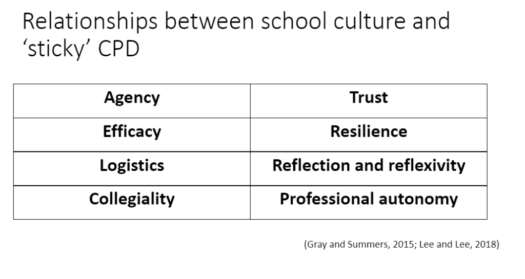 My thesis research focuses on the relationships between school cultures and teacher professional development and learning. I make the distinction between professional development as activities and learning as changes in attitudes and practices, as McChesney and Aldridge (2019) do. I think this makes it easier to talk about what is going on in this area in a clearer way.