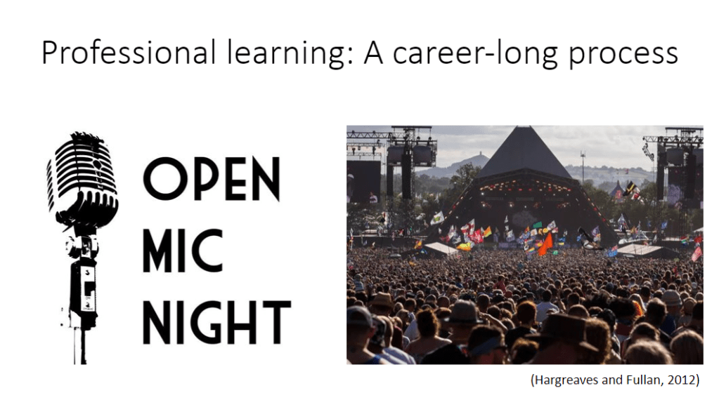 There are a couple of things about teacher professional learning that I hold to be true, and which are supported by literature in the field. Firstly, we should expect teacher professional learning to be an ongoing process. I work with Early Career Teachers, and I love it when they express their hunger for professional development opportunities. I like Hargreaves and Fullan’s (2012) analogy to illustrate this point. ECTs are like the best band on a Saturday night in the local pub; they’re talented, they’re enthusiastic, they’re up for it. They’re great! But we all need to be engaged in a career long endeavour to get to the Pyramid Stage at Glastonbury (or the O2, if you prefer, although there are definitely times in teaching where an analogy associated with wading through mud works…)
