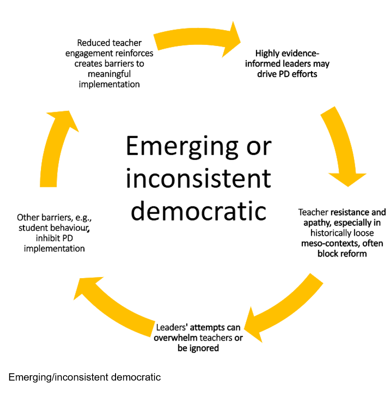 In systems characterised by loose democratic PD provision, leaders want evidence informed teaching and learning, but workload concerns prevent tight PD arrangements. Low teacher engagement with voluntary PD is a persistent frustration. Two consequences are associated with loose arrangements. Firstly, PD1 (the content/theory/practice which is to be delivered) is often transmissive, and experienced by some teachers as a de-facto deficit model (Kennedy, 2014). Lacking PD2 contextualisation (structured, logistically supported opportunities for discussion, action research and co-creation, upon which deep understanding and sustained learning depends), teachers experience PD as infantilising, generic or irrelevant.