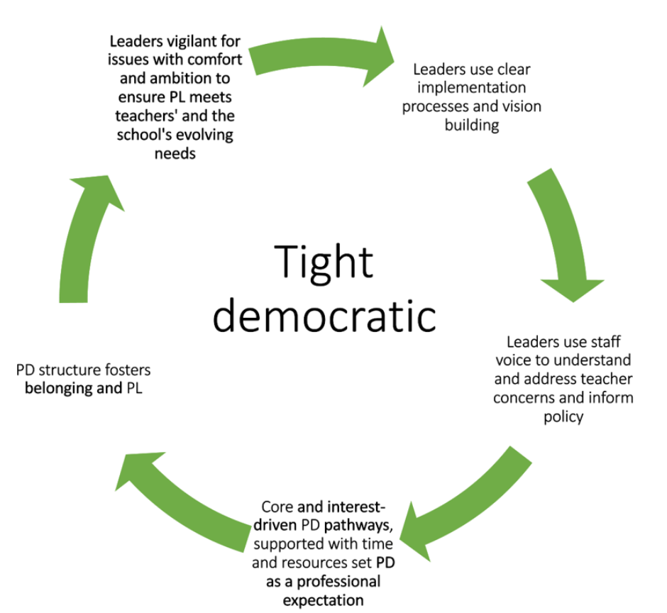 In tightly democratic school contexts, core and interest-driven pathways are provided, but all must engage with something. Coaching is mandatory. To use Stenhouse’s (1991) analogy, teachers may choose what moves to make on the chess board, but everyone is expected to play. My data suggests that the tight democratic pattern is associated with the highest quantitative mean survey scores associated with high congruence: most teachers experience their school culture for learning positively, and there are few outliers. This indicates a correlation between teacher openness to PL and tightly curated democratic conditions characterised by structurally supported mandatory (or at least high voluntary) engagement with PD2, implemented at a manageable pace over time. Organisational belonging and pride (understanding universal acceptance is an impossible ideal) is also indicated. Leaders should remain mindful of problems of comfort and ambition, however, as it is desirable for organisations to allow some un-curated ideas into their PD ecosystems to avoid groupthink (Epstein, 2019).